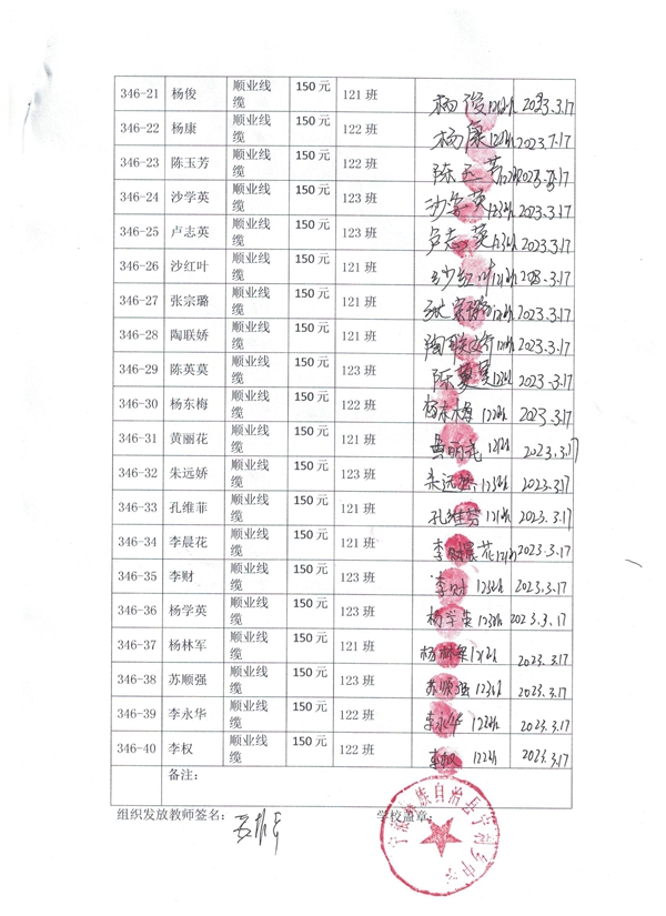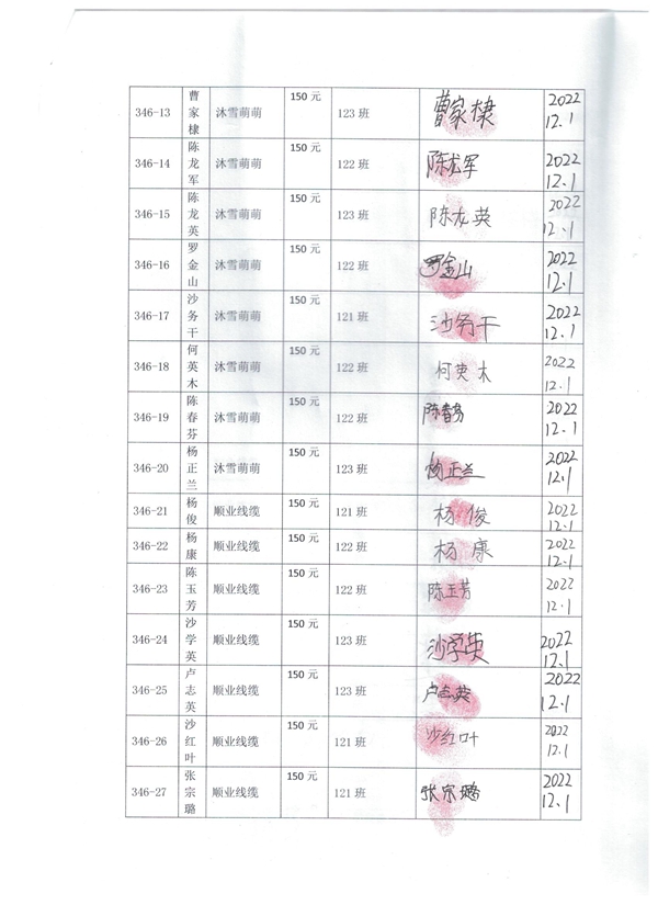 二、本批第346批40名学生由1)沐雪萌萌捐助20名(346-01至346-20);2)顺业线缆捐助20名(346-21至346-40)