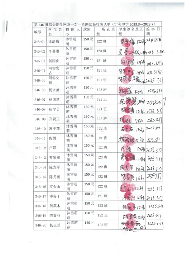 第346批宁利中学(2023年3月到2023年7月)受助学生签收单