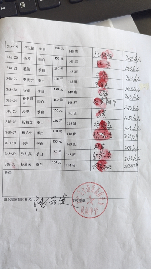 第348批宁蒗民族中学-初中部(2023年9月-2024年2月)受助学生签收单