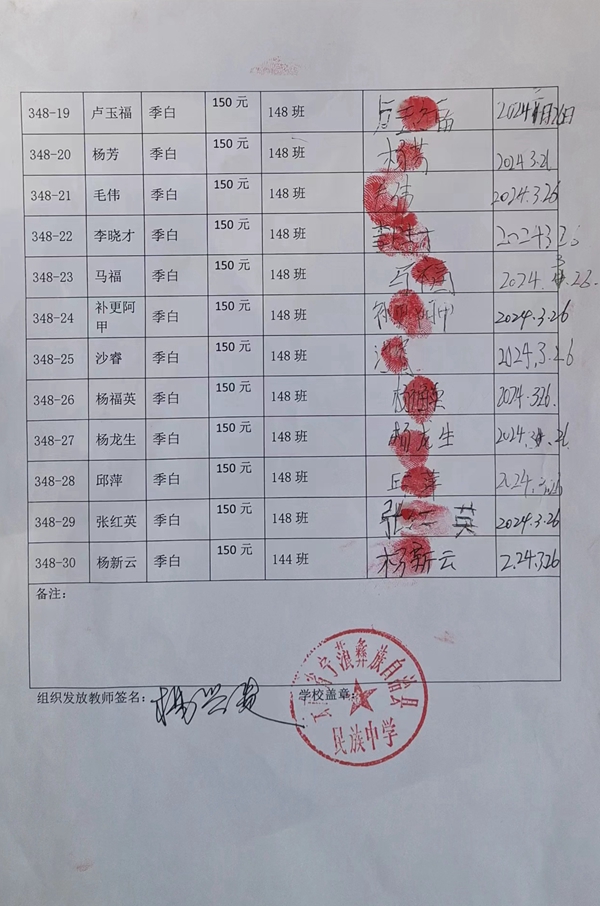 第348批宁蒗民族中学-初中部(2024年3月-2024年7月)受助学生签收单