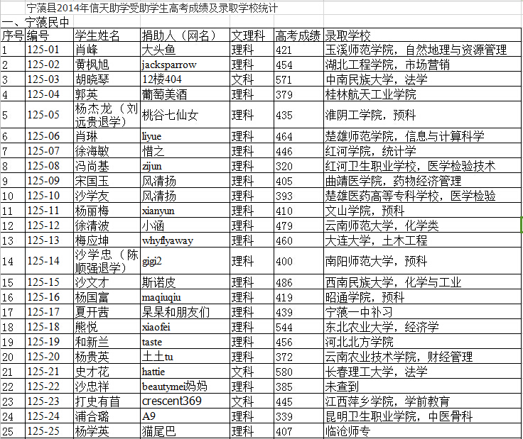 宁蒗县2014年信天助学高考成绩和录取学校情况