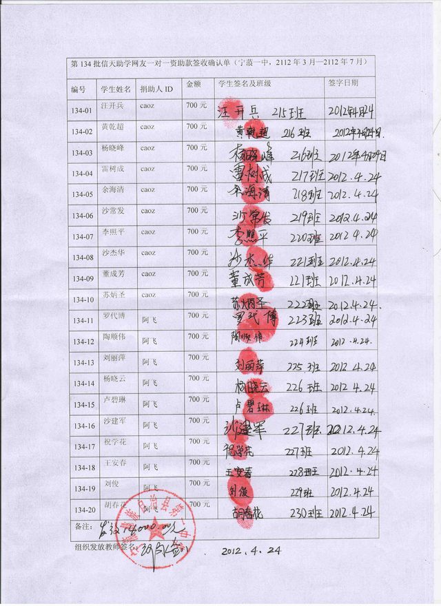 高一年级学生,编号134-01----134-20:资助款为3500元/人,2012年3月---2014年7月,共5个学期,一个学期700元。