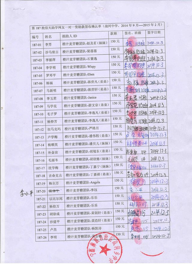 6、全部捐助款到漫步轻灵这里后,她会按学期分次汇给浦理智老师,浦理智老师和学校的负责老师再分发给受助学生(学生每学期收到150元),一一签字确认。知识改变命运,愿这些学生将来不再重复父辈们那艰辛苦难的日子。