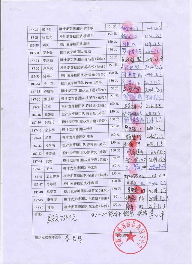初一年级学生,编号187-01----187-50:资助款为900元/人,2014年9月----2017年7月,共六个学期,一个学期150元。