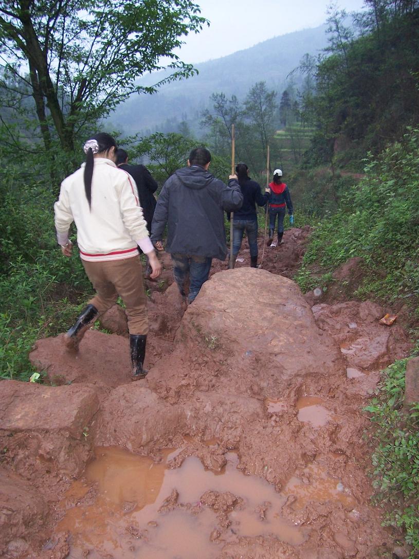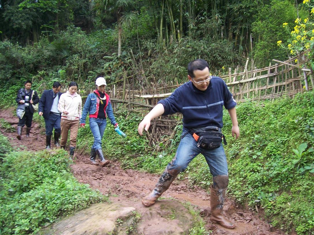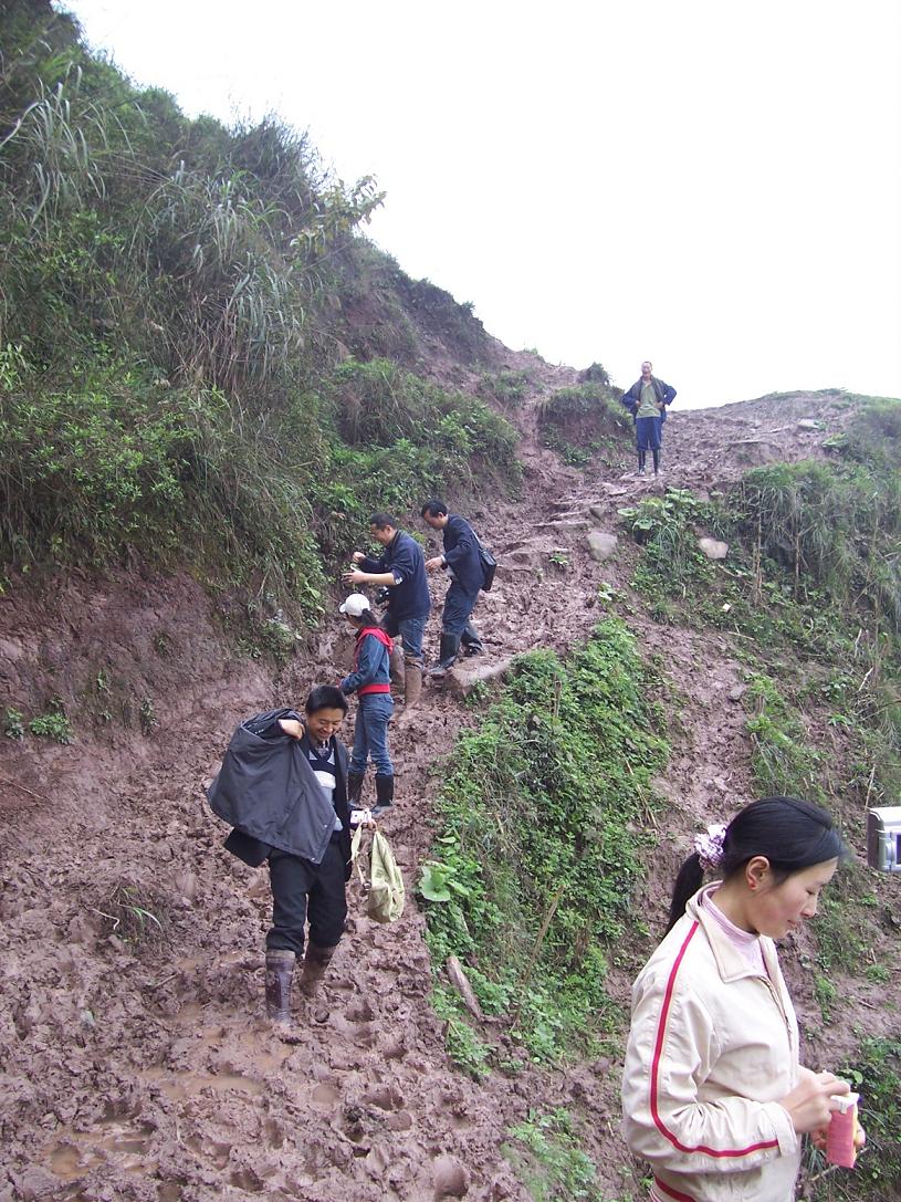 民主乡是四川马边县的一个偏远山乡,交通极为不便,外面来的车子只能沿着土公路开到村镇街道旁,连街道都进不去,全乡22个校点有21个要靠在崎岖的山路上步行才能去得到,老陈来的时候又正赶上雨湿天气,泥泞的山路很是难行,对于老陈这个生活在大城市、从来没有走 过这样的路的人自然更是难行了,老陈自己说:“马边的土地同我很亲密,老要跟我亲近一下,我摔了七跤半……”