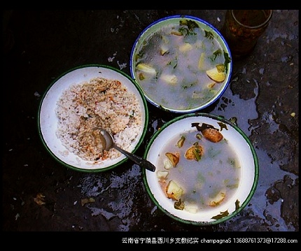 下图就是他们吃的饭食,地上黑色的就是土豆,左边是干面,右边是两碗茶水。