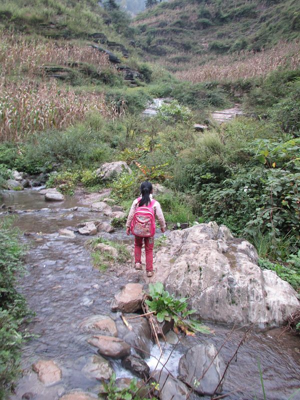 这个孩子所在学校是聚河小学,110多个学生中有40多个学生同这个女孩走的是同一条路,一下大雨,这条小河洪水暴涨,这个小学就会有三分之一的孩子无法到学校上课了……