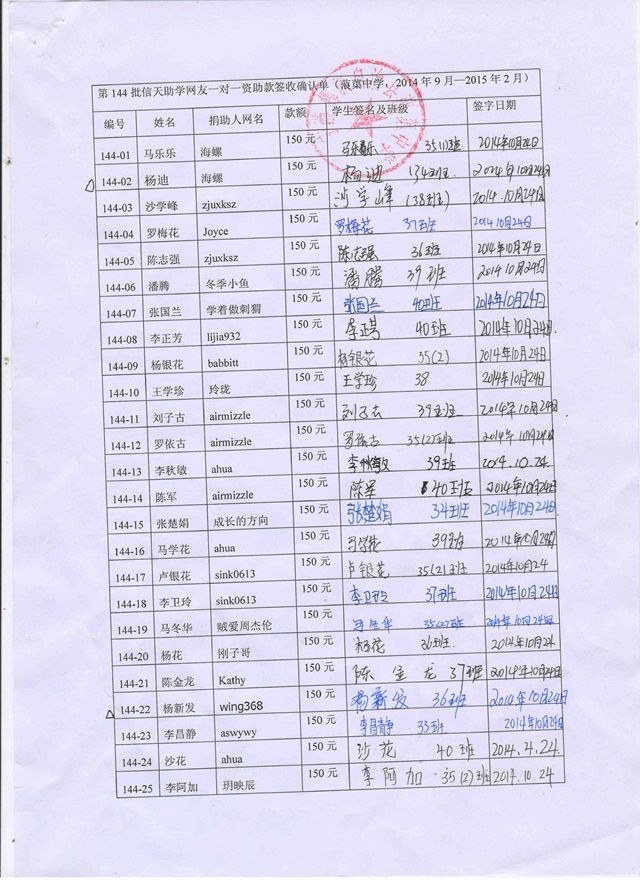 第144批l蒗渠中学(2014年9月-2015年2月)受助学生签字确认单