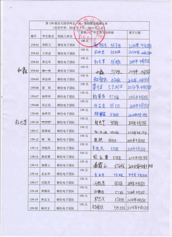 第159批拉佰中学(2014年3月-2014年7月)受助学生签字确认单