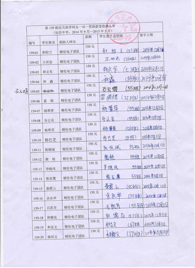 第159批拉佰中学(2014年9月-2015年2月)受助学生签字确认单