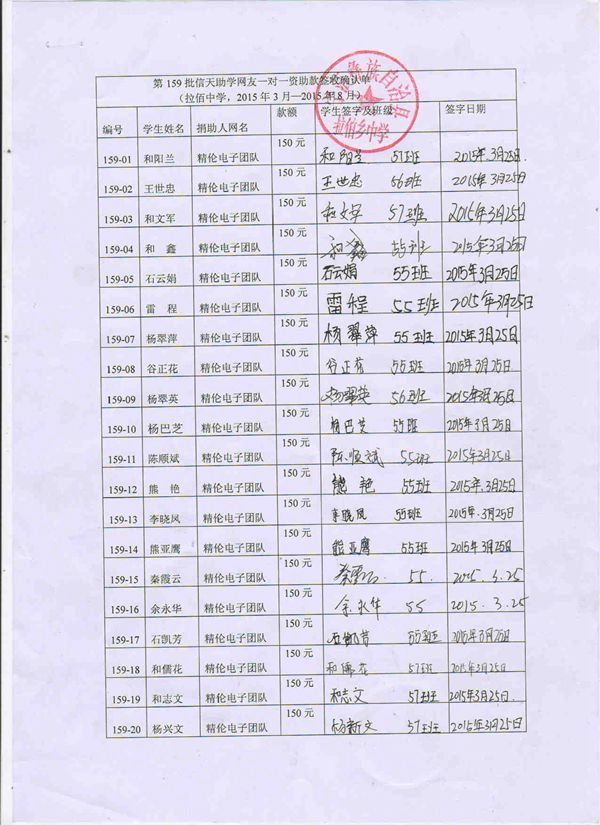 第159批拉佰中学(2015年3月-2015年8月)受助学生签字确认单