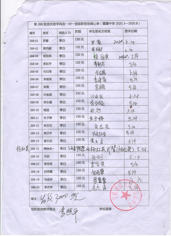 第268批蒗渠中学(2020年3月-2020年8月)受助学生签字确认单