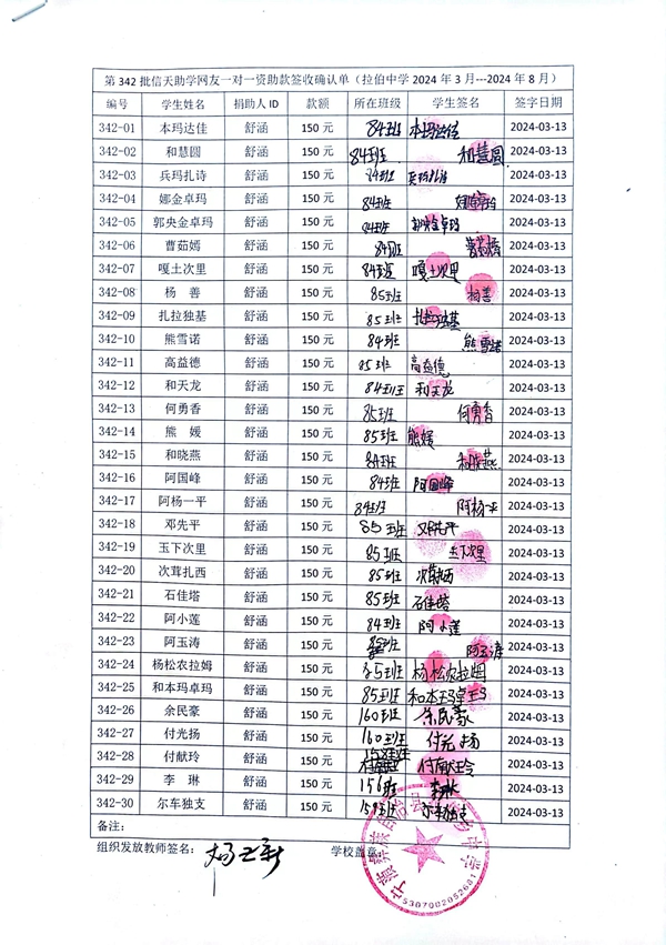 第342批拉伯中学(2024年3月-2024年7月)受助学生签收单
