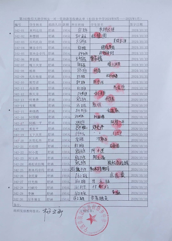 第342批拉伯中学(2024年9月-2025年2月)受助学生签收单