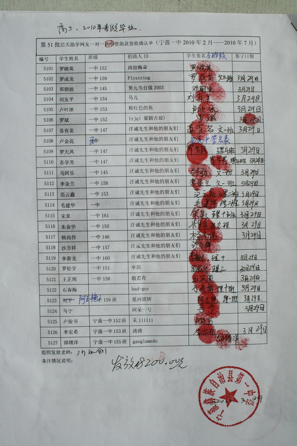 宁蒗一中51批(2010.3-2010.7)受助学生签字确认单