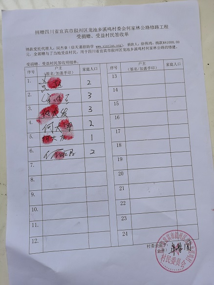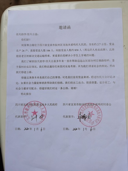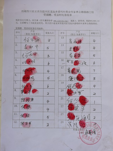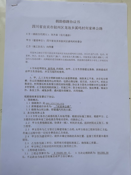 何家林公路位于四川省宜宾市叙州区龙池乡溪鸣村人民组,全长约2.7公里,起点:何家林,终点:里北抖。受益农户26户,直接受益人数106人,间接受益人数约850人(周边的人也走此路)。此路能给老百姓解决交通运输困难,更重要的是解决小学生上学难的问题。村民修路决心很大,全力集资,300元/户,共集资7800元,计划修通土路、支路、涵管、并铺设部份路面块石,力争雨季也能通车。