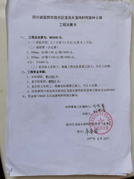 (5)修路预算分好几部分,有挖掘机、涵管、炸药爆破(山崖需要爆破)、堡坎、村民义务工、征地等。修路,我们不全包,我们出一大部分钱:挖掘费用、山崖爆破等。村民出义务工、涵管、征地费、村民小额集资。