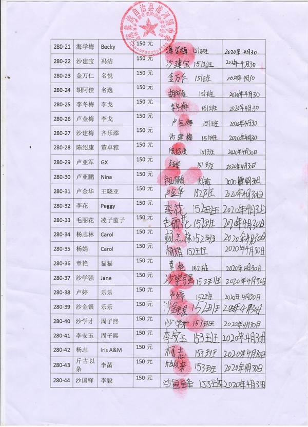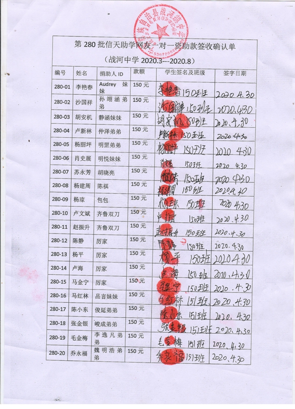 第280批战河中学(2020年3月-2020年8月)受助学生签字确认单