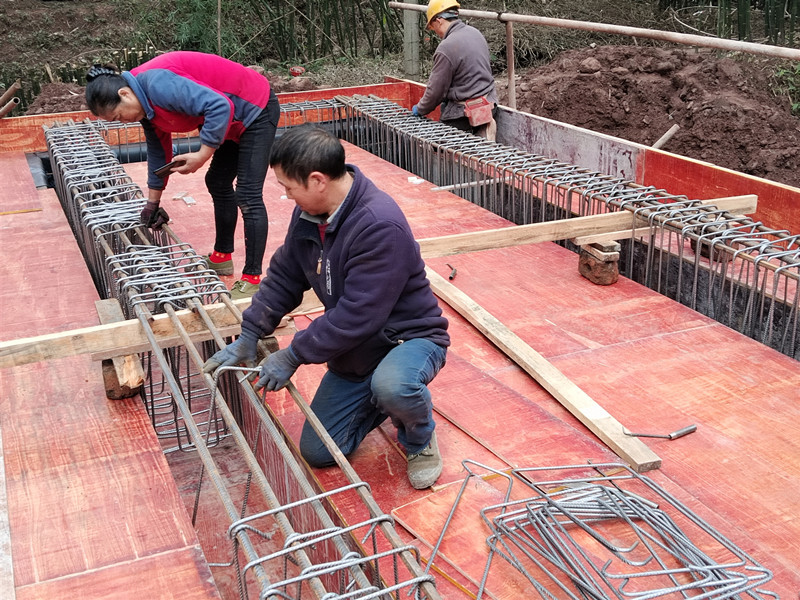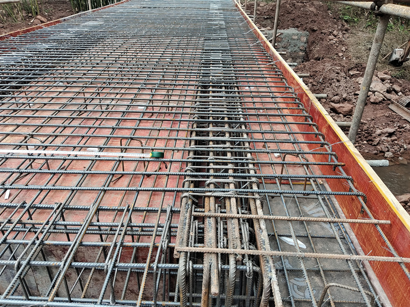 桥面铺设模板,桥梁绑扎钢筋。