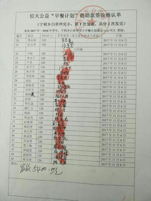 信天公益“早餐计划”捐助款签收单(宁利乡白草坪完小)1.jpg