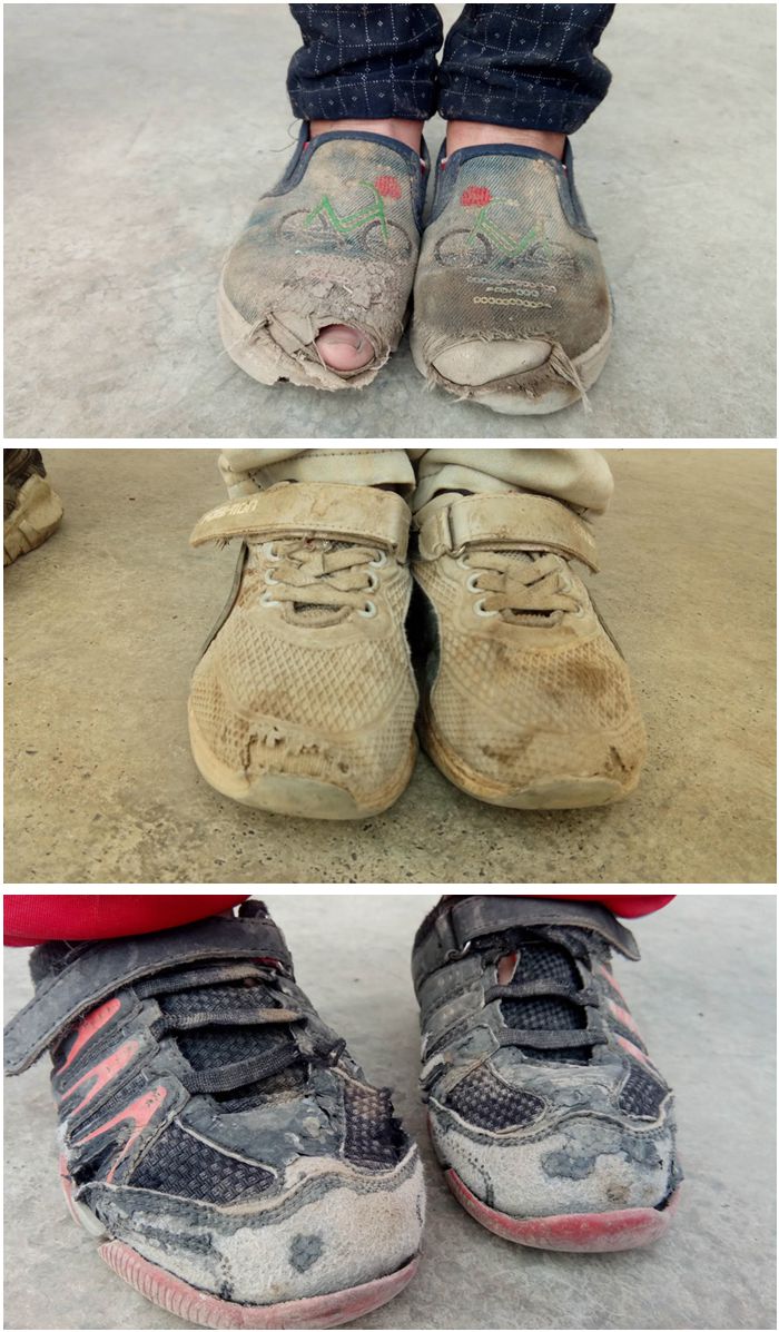 幼儿园孩子们穿的旧鞋子,有点都破了。于是爱心朋友组织捐赠衣服、鞋子玩具给山区的孩子们。