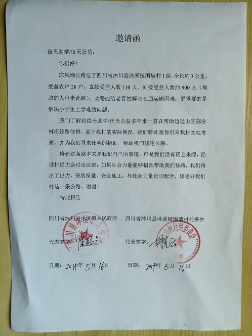 凉风坳公路位于四川省沐川县沐溪镇围墙村1组,全长约3公里,起点:凉风坳,终点:春天坪。受益农户28户,直接受益人数110人,间接受益人数约900人(周边的人也走此路)。此路能给老百姓解决交通运输困难,更重要的是解决小学生上学难的问题。村民修路决心很大,全力集资,300元/户,共集资8400元,计划修通土路、支路、涵管、并铺设部份路面块石,力争雨季也能通车。