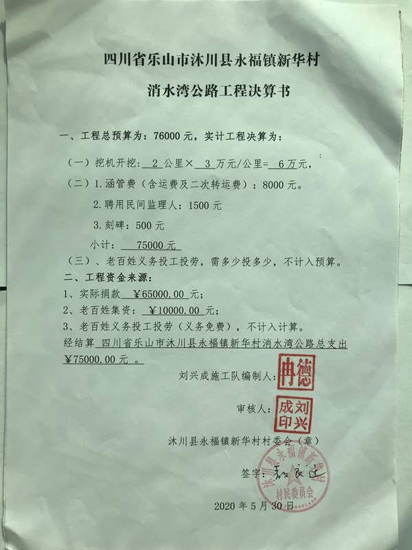 (5)修路预算分好几部分,有挖掘机、涵管、炸药爆破(山崖需要爆破)、堡坎、村民义务工、征地等。修路,我们不全包,我们出一大部分钱:挖掘费用、山崖爆破等。村民出义务工、涵管、征地费、村民小额集资。