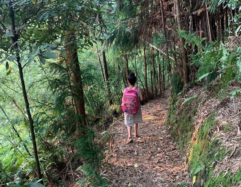 小学生上学之路,等修好了路之后,就可以坐三轮车、面包车上学了,或者骑自行车上学了。