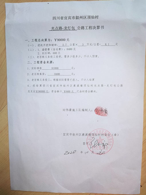 (5)修路预算分好几部分,有挖掘机、涵管、炸药爆破(山崖需要爆破)、堡坎、村民义务工、征地等。修路,我们不全包,我们出一大部分钱:挖掘费用、山崖爆破等。村民出义务工、涵管、征地费、村民小额集资。