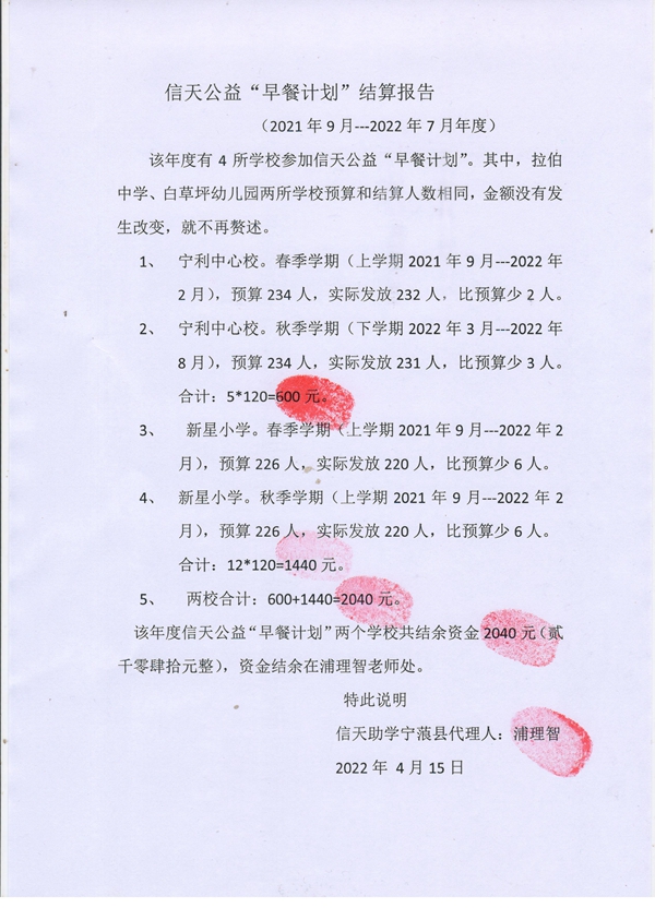 2021年9月-2022年7月宁利中心完小、永宁镇新星小学早餐最终浦老师处结余:2040元。