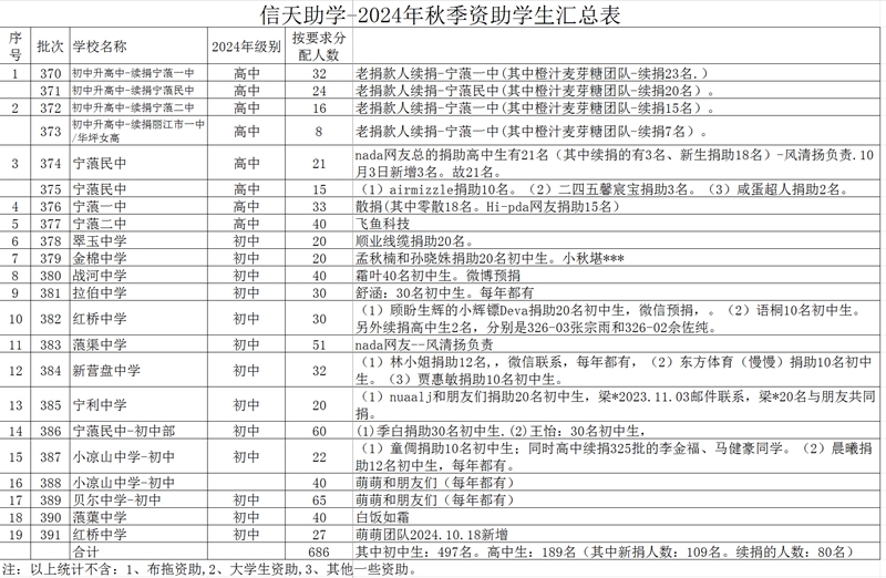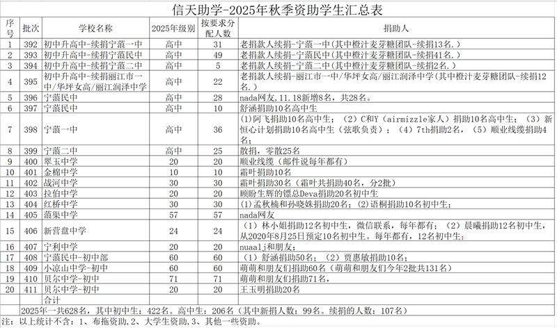 (3)学生名单等到暑假开学后根据考试成绩、家庭情况,再做挑选。因为秋季开学后接连很多假期,如教师节、中秋节、国庆节、火把节等。所以受助生名单出来会在9-10月份陆续提供,个别批次的名单会到11月份出来。敬请理解。