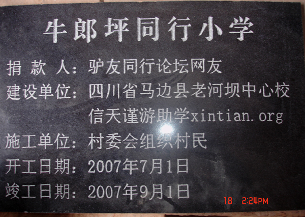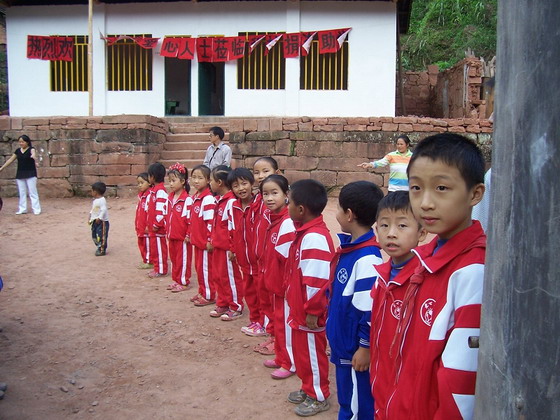蓝调共和走访记录:"致辞结束后,大家在校舍前的楼梯合影。校舍上本来挂着条幅,因为我从广东出发,所以校方误以为我们四人都是从广东来的,因此条幅上热情的写着“欢迎广东爱心人士莅临我校捐资助学”,一是说法不确切,而且爱心人士没有地域差别,无论广东北京还是我们同行论坛;二是这种说法看着太正式,有些别扭,还是不要作罢。本来有32名学生,有3名学生开学后和外出打工的父母离开牛郎坪了,照片里面只有29名学生。‘