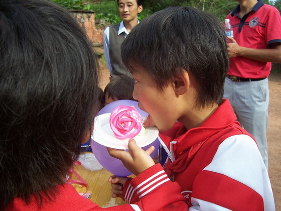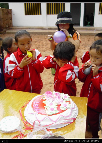 蓝调共和走访记录:"一看到蛋糕,围过来的孩子太多,为了分散他们的注意力,我先分了气球。因为自己小时候喜欢吹气球,所以带了一袋过去。没想到那么受孩子们欢迎。他们很喜欢吹,可又怕吹爆,胆小着呐,我就先示范一个——气球不可怕嘛。”