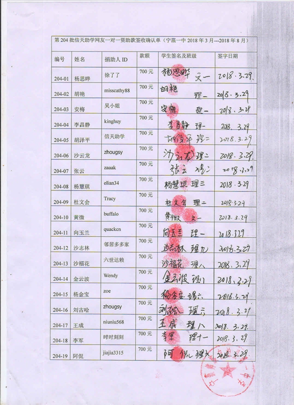 第204批宁蒗一中(2018年3月-2018年8月)受助生签收单