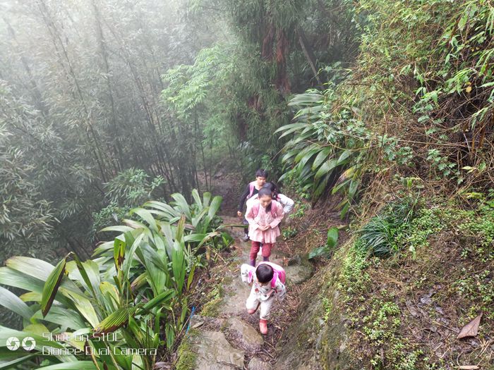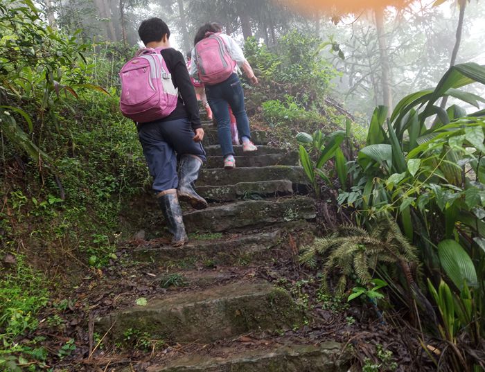 小学生上学之路,等修好了路之后,就可以坐拖拉机上学了,或者骑自行车上学了。