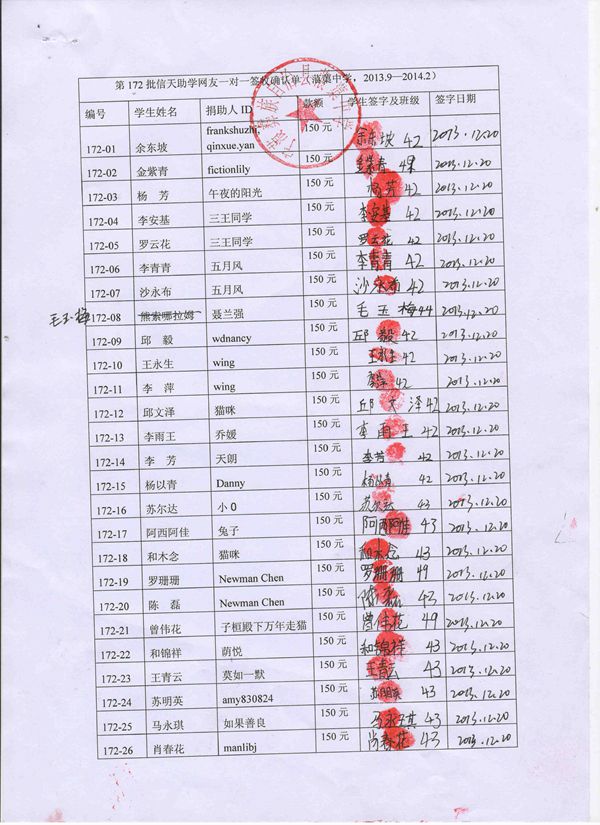 第172批蒗渠中学(2013.09-2014.02)受助学生签字确认单