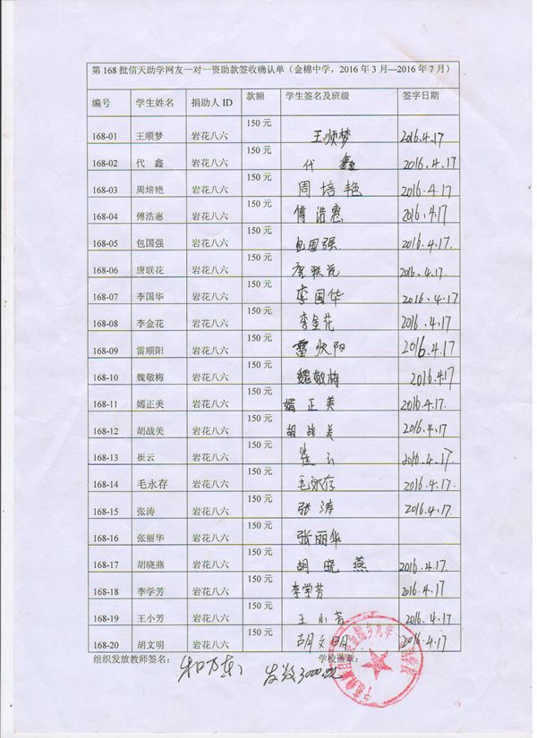 第168批金棉中学(2016年3月-2016年7月)受助学生签收单