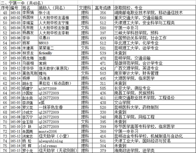宁蒗县2016年信天助学高考成绩和录取学校情况