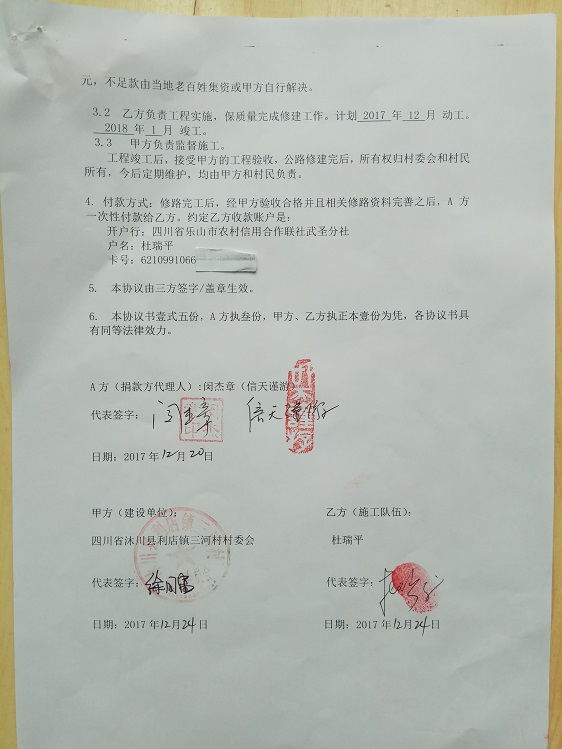 (5)修路预算分好几部分,有挖掘机、涵管、炸药爆破(山崖需要爆破)、堡坎、村民义务工、征地等。修路,我们不全包,我们出一大部分钱:挖掘费用、山崖爆破等。村民出义务工、涵管、征地费、村民小额集资。
