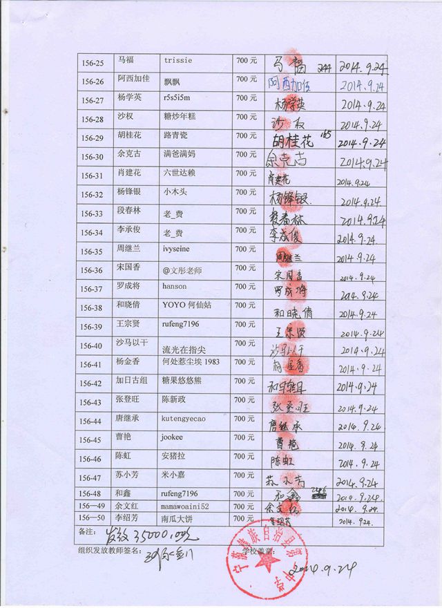 第156批宁蒗一中(2014年9月-2015年2月)受助生签收单