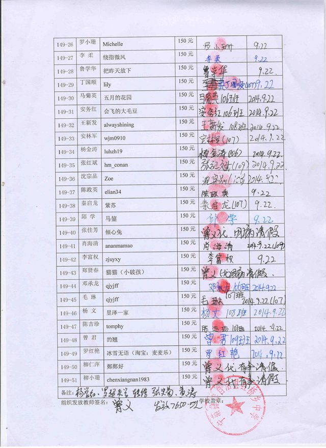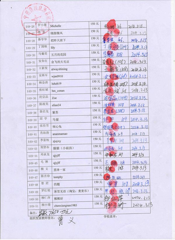 第149批红桥中学(2014年3月到2014年7月)受助学生签收单