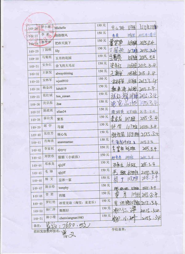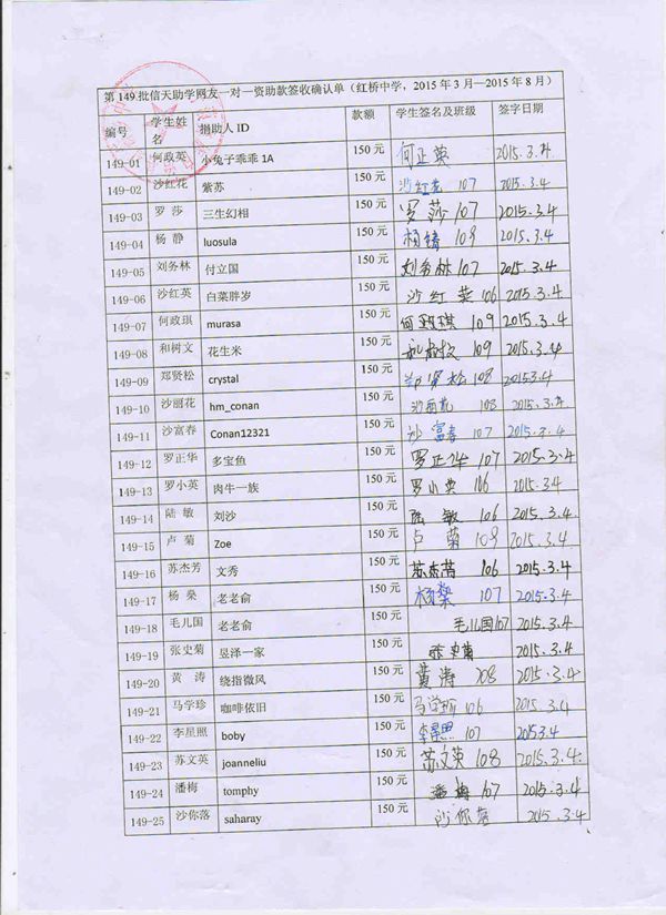 第149批红桥中学(2015年3月到2015年8月)受助学生签收单: