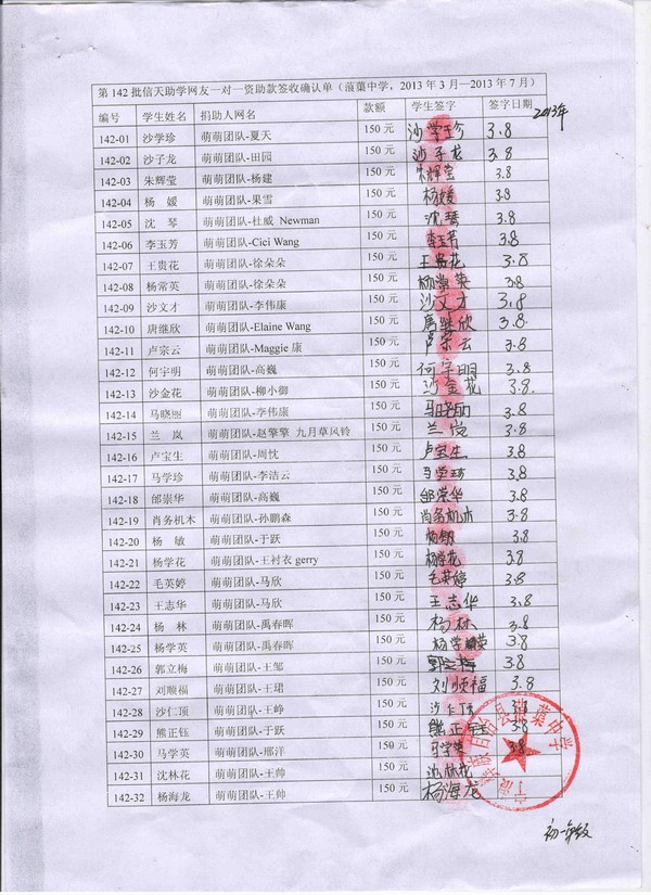 蒗渠中学第142批(2013.3-2013.7)受助学生签字确认单: