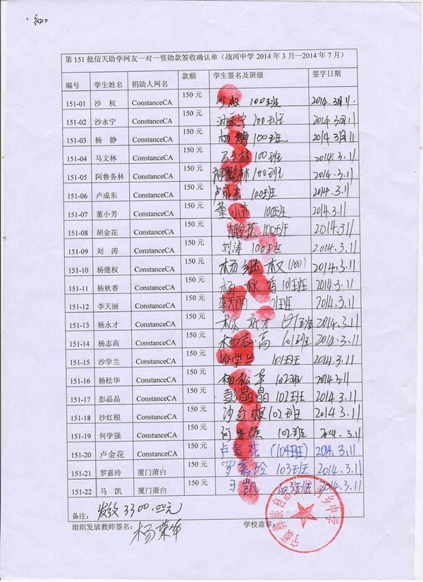 第151批战河中学(2014年3月到2014年7月)受助学生签收单