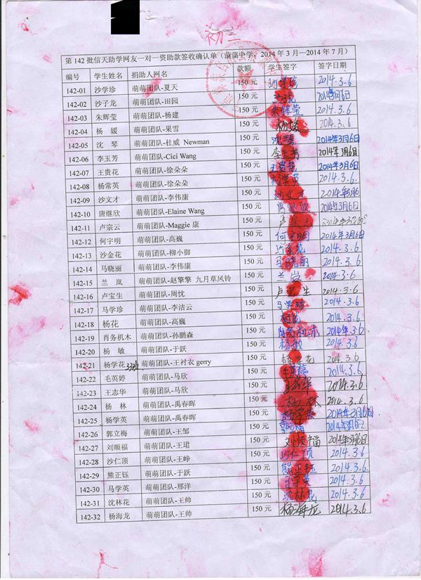 第142批l蒗渠中学(2014年3月-2014年7月)受助学生签字确认单