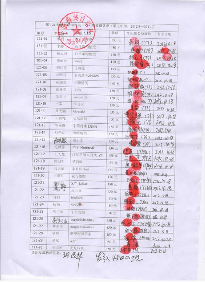 第121批翠玉中学2012.3-2012.7资助款发放签收确认单: