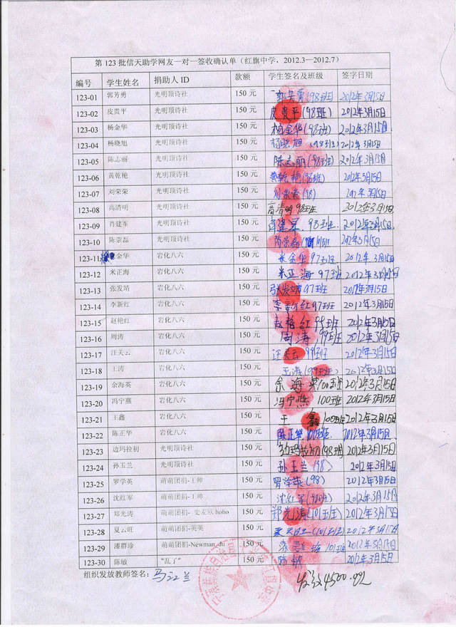 红旗中学123批(2012年3月-2012年7月)一对一助学款发放签名表
