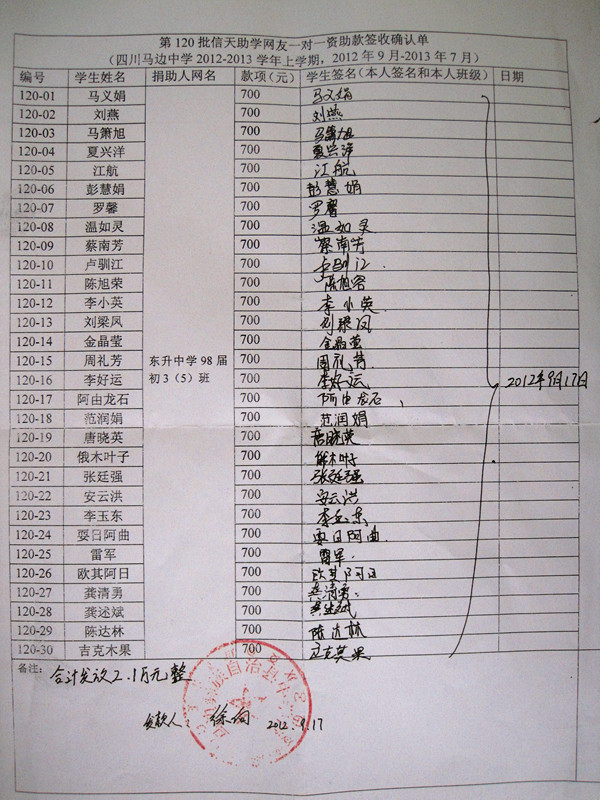 备注:120-03马箫旭因跟着老师外出参加培训学习,待回校后,再发资助金。(在此期间资助款700元由徐向暂为保管)