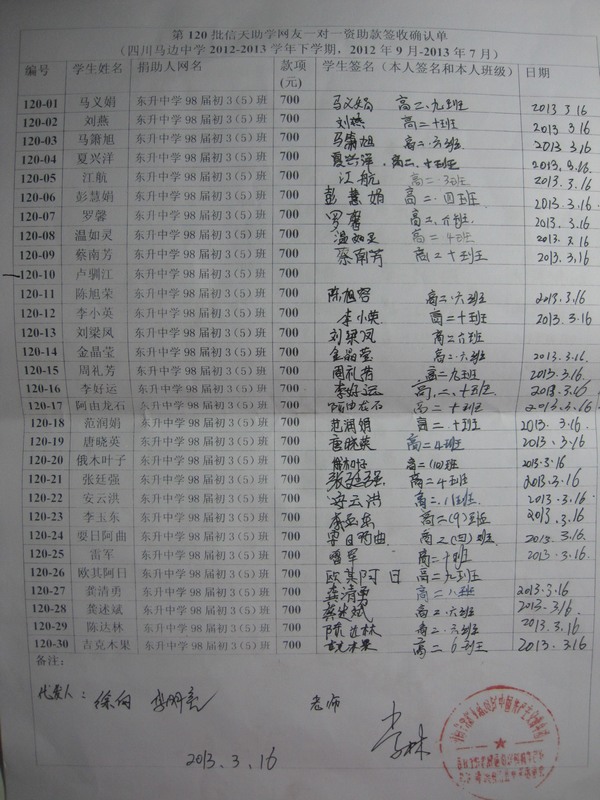 第120批马边中学2012-2013学年上学期(2012.9--2013.7)受助学生签收单:
