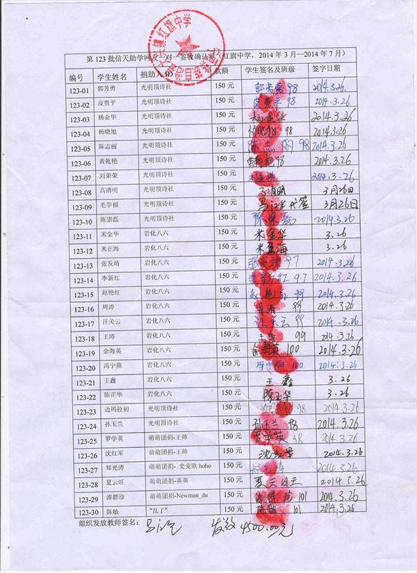 第123批红旗中学(2013年9月-2014年2月)信天助学款发放签名表